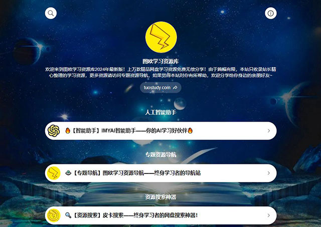 图欧学习资源库2024新版是一个基于阿里与夸克网盘平台的综合性免费公益无广告的学习资源网站,网站内容是阿里学习资源舱和夸克资源小海洋的学习型资源精选版,由站长图欧君精心整理出品,并且会一直维护下去。