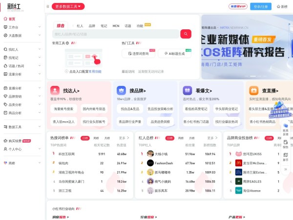 作为数据驱动的内容科技公司,新榜覆盖全平台各层级新媒体资源,提供内容营销、直播电商、培训运营、版权分发等服务,聚力数字营销,助力中国企业数字化内容资产获取与管理,服务于内容产业,以内容服务产业。