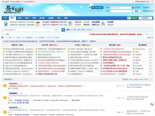 吾爱破解关注PC软件安全和移动安全领域,致力于软件安全与病毒分析的前沿,丰富的技术版块交相辉映,由众多热衷于软件加密解密及反病毒爱好者共同维护,留给世界一抹值得百年回眸的惊艳,沉淀百年来计算机应用之精华与优雅,信息线条与生活质感淡定交融,任岁月流转,低调而奢华的技术交流与探索却亘古不变。
