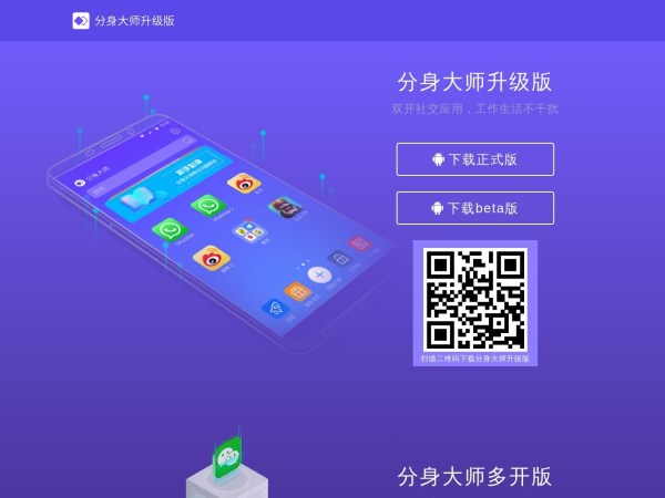 分身大师是一款简单易用、应用双开、分身工具。一部手机,微信、陌陌、QQ、游戏等,安全隐私有保障,双开助手多开分身。