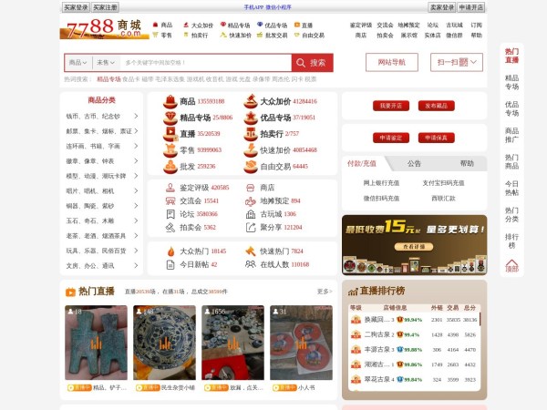 7788商城(全称:7788商城___二手、旧货、收藏、艺术品、工艺品等七七八八商品交易平台)于2025年01月20日收录在本站生活购物导航分类,并成功建立了索引服务,为用户提供查找/检索服务。