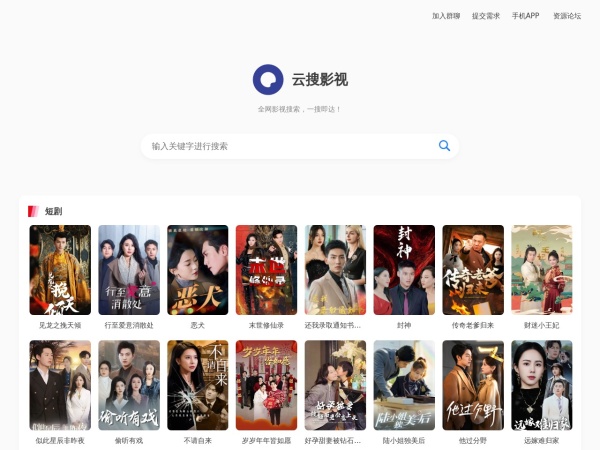 云搜影视(全称:云搜影视 - 短剧 影视 动漫 综艺等全网搜索)于2025年01月25日收录在本站视频综合导航分类,并成功建立了索引服务,为用户提供查找/检索服务。