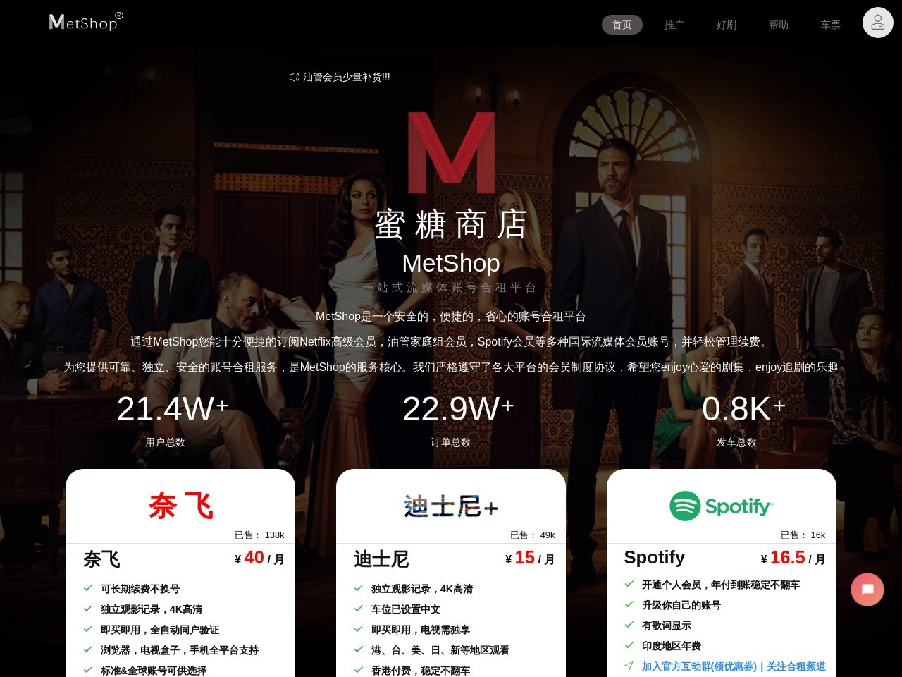 蜜糖商店(全称:蜜糖商店MetShop·一站式流媒体合租平台)于2025年02月20日收录在本站生活购物导航分类,并成功建立了索引服务,为用户提供查找/检索服务。