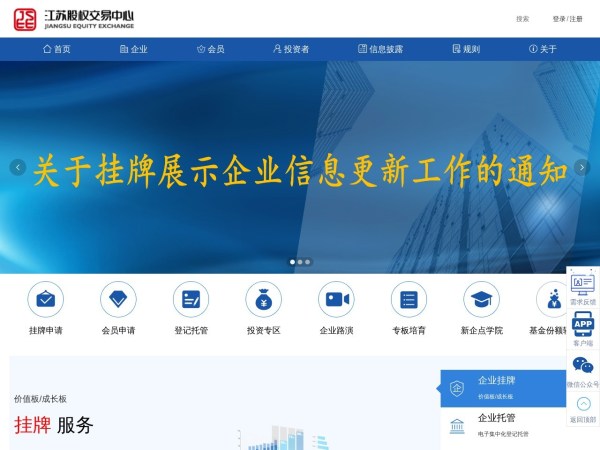 江苏股权交易中心(以下简称中心)是遵循证监会对中国多层次资本市场体系建设统一要求,经江苏省人民政府授权批准设立的江苏省行政区域内唯一合法的区域性股权市场运营机构。作为多层次资本市场金字塔体系的基础层次部分,中心的主要服务对象为创新创业型中小微企业,经营范围包括:为非上市的公司股权、债券、资产和相关金融及其衍生品的批准募集挂牌、登记、托管、交易、融资、结算、过户、分红、质押等提供场所、设施和服务;组织和监督市场活动,发布市场信息;代理挂牌产品买卖服务;为市场参与方提供咨询等综合服务。