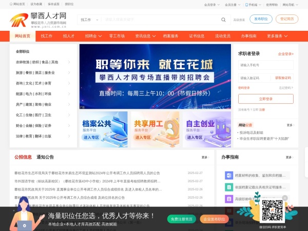 攀西人才网(全称:攀西人才网—立足攀枝花打造攀西地区求职招聘网站)于2025年03月07日收录在本站办公招聘导航分类,并成功建立了索引服务,为用户提供查找/检索服务。