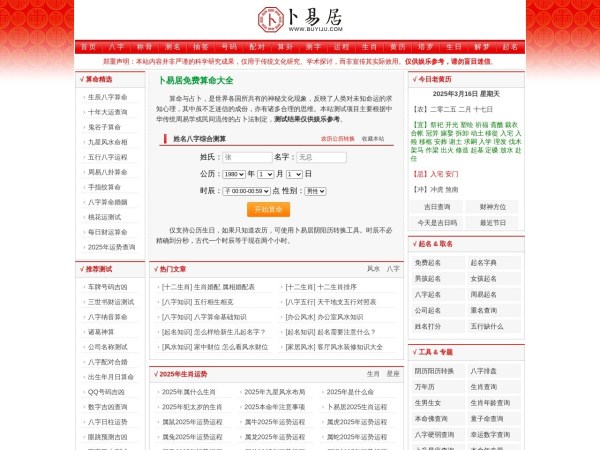 卜易居算命网(全称:免费算命,生辰八字算命,周易占卜,姓名测试打分-卜易居算命网)于2025年03月16日收录在本站工具搜索查询导航分类,并成功建立了索引服务,为用户提供查找/检索服务。