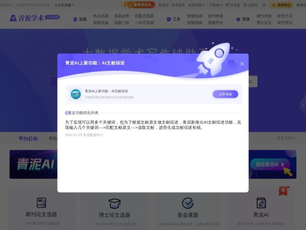 青泥学术(全称:青泥学术-大数据学术写作辅助系统)于2025年03月24日收录在本站学习学术导航分类,并成功建立了索引服务,为用户提供查找/检索服务。