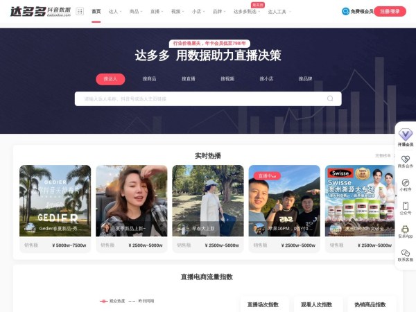 达多多数据(全称:达多多数据:抖音数据查询平台。抖音直播电商带货数据分析报告查看工具,免费查询抖音直播、短视频、抖店等抖音数据)于2025年03月27日收录在本站运营数据分析导航分类,并成功建立了索引服务,为用户提供查找/检索服务。