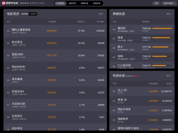 猫眼实时票房(全称:猫眼专业版-实时票房)于2025年03月27日收录在本站运营数据分析导航分类,并成功建立了索引服务,为用户提供查找/检索服务。