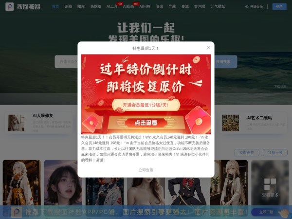 搜图神器(全称:搜图神器官方网站-一键搜索聚合,海量图片资源免费下载!)于2025年04月02日收录在本站设计图库导航分类,并成功建立了索引服务,为用户提供查找/检索服务。