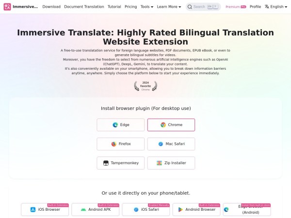 沉浸式翻译(全称:沉浸式翻译 - 双语对照网页翻译插件 | PDF翻译 | 视频字幕翻译)于2025年04月19日收录在本站学习语言导航分类,并成功建立了索引服务,为用户提供查找/检索服务。