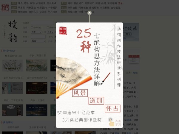 搜韵(全称:搜韵-诗词门户网站)于2025年04月19日收录在本站资讯门户导航分类,并成功建立了索引服务,为用户提供查找/检索服务。