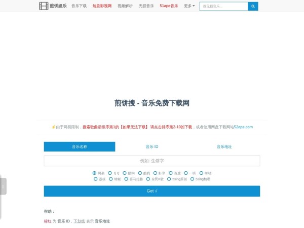煎饼搜音乐下载网(全称:煎饼搜音乐下载网 - 全网音乐免费下载 搜你妹音乐在线下载高清无损超清音乐网)于2025年05月01日收录在本站音乐歌曲导航分类,并成功建立了索引服务,为用户提供查找/检索服务。