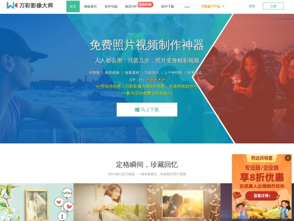 万彩影像大师,免费的照片视频制作软件.200+精美模板和海量素材,一键替换便可快速创作效果出众的婚礼相册视频、宝宝成长记录、年会视频、毕业相册视频等。