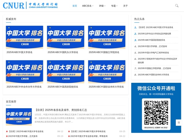 中国大学排行榜官网(China University Rankings,简称CNUR),专注于高校动态,榜单有ABC中国大学排名,ABC中国民办大学排名,中国研究生院校排名,ABC中国高职院校排名。