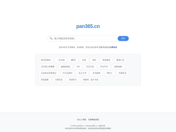 盘365是专业的网盘搜索引擎,上亿级的网盘资源下载,最实用的百度云搜索引擎,名副其实的超级网盘搜索神器!实时收录百度云、百度网盘、夸克网盘、夸克电影等资源,每天定时更新各类高清电影、视频、种子、小说、软件等各类网盘资源,百度网盘搜索及夸克资源搜索就找盘365!